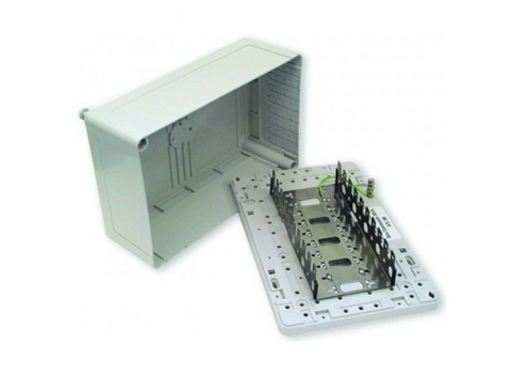 It is a wall mounted 50 Pair voice connection box constructed in mid grey incombustible PVC. Produced with a 5-way back mount frame which will accept 5 off 10pair LSA connection or disconnection modules. Its principal use is to build connection for CW1297/1308 voice cabling.